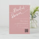 Erleben Sie die Braut-to-Bräune mit dieser staubigen Rose-Brautdusche, die mit schicker Kalligrafie und einem modernen, scannbaren QR-Code für Registrierung oder UAWG ausgestattet ist. Das fließende weiße Skript verleiht der Rose eine romantische Touch, während der Hintergrund der weichen Schrift ein elegantes, feminines Ambiente bietet. Personalisieren Sie Ihre Veranstaltungsdetails und gestalten Sie die Planung einfach und stilvoll.
