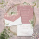 Alles in einer staubigen Rose mit hübschen Saitenlichtern, Blumengrün und eleganter Typografie. Die Einladung enthält eine perforierte RSVP-Karte, die für Sie individuell adressiert oder links als leere Karte für die Handschrift der Adressdaten Ihres Gastes verwendet werden kann. Entwickelt von Thisisnotme©