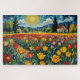 Ein schönes blühendes Feld mit roten und gelben Tulpen unter einer gelben Sonne, Zypressen und weißen Stuckhäusern mit roten Ziegeldächern, die im Stil von Vincent Van Gogh gemalt wurden.