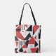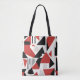 A bold composition of red, black, and white geometric shapes, including triangles, rectangles, and lines, forming a modern abstract design.