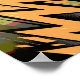 Das Design zeichnet sich durch eine kühne, Comic-Stil-Komposition aus, die von großen, gezackten, blitzförmigen Formen in goldorange dominiert wird, die schräg über die Leinwand ragen. Diese scharfen Formen sind schwarz umrissen und erzeugen ein Gefühl von Power und Intensität. Der Hintergrund verbindet tiefschwarz und dunkelgrau mit vertikalen Streifen in Olivgrün und dunklem Rot, die Tiefe und Kontrast erhöhen. Geschliffene goldorange Funken verstärken den Eindruck von Geschwindigkeit, Energie und explosiver Bewegung. Insgesamt vermittelt das Kunstwerk eine dramatische, wirkungsvolle Szene, die an die Wirkung von Manga oder Comic erinnert.