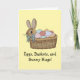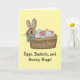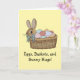 This sweet illustration features an adorable bunny with a blue patterned bow sitting in a woven basket filled with pastel-colored eggs. Perfect for Easter greetings, springtime notes, or messages for kids and families, this design captures the gentle joy of the season. The soft tones and charming character make it ideal for sharing warmth, celebration, and cheer. A great choice for sending love to friends, family, or anyone who enjoys classic Easter imagery with a touch of whimsy.