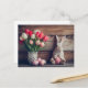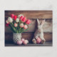 Easter bunny seated beside colorful eggs and tulip postkarte