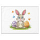 Cartoon smiling Easter bunny sitting between two Easter eggs, butterflies flying around him