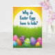 This design shows a bright yellow-to-orange arc near the top, like a rising sun warming the scene, and inside its soft white curve the question “Why do Easter Eggs have to hide?” appears in rounded blue lettering. The text sits centered within the arc, giving it a friendly, inviting look that feels like a gentle nudge from a close friend. Below, a wide field of rich green grass fills the lower half, with blades overlapping and curling as if they’re leaning in together. Tucked among the grass are several decorated eggs, half-hidden in a way that suggests a sweet little secret being shared 🐰. One egg is deep purple with light polka dots, another is green with stripe patterns, and a brown one has a textured look that adds cozy contrast. Small touches of pink, blue, and orange appear across the eggs, tying them back to the warm arc above and adding a soft, affectionate energy 🌷. The grass is layered thickly around the eggs, with the brightest highlights catching along the tips of the blades.