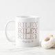 Eine weiße Tasse mit einem wiederholten All-Caps Monoline Namensdesign. Die mittlere Linie ist fett in staubigen Ton, mit einem Skriptbegriff "Einzigartiges Ich" unten. Die minimale Anordnung gleicht fett formatierte Typografie und sanftes, neutrales Detail für eine raffinierte Tasse im Alltag aus.