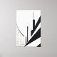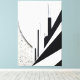 Vertical and diagonal black-and-white lines rise from a textured cosmic background, suggesting an abstract city in ascent. A fusion of minimalism and urban energy.