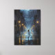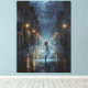 Eine traumhafte, ölbemalte Nachtlandschaft, in der ein Mädchen fröhlich im Regen auf einer leuchtenden Stadtstraße tanzt. Lichter, die das nasse Bürgersteig in einer romantischen Feier von Freiheit und Liebe widerspiegeln.