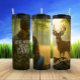 Eine Frau von hinten, die eine Tarnkappe mit "REAL FRAOMEN WEAR CAMOUFLAGE" trug, bedruckt mutig, kniet in einem sonnenverwüsteten Wald. Ein majestätischer Hirsch steht ihr gegenüber, und eine Erholung in der Nähe, die eine ruhige und bestärkende Jagdszene in der Natur hervorhebt.