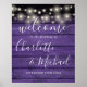Avec de jolies lampes à cordes et des noms de style signature, cet élégant panneau d'accueil rustique peut être personnalisé avec vos informations en lettrage chic sur un arrière - plan de panneaux de bois violet. Conçu par Thisisnotme©