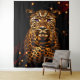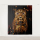 Eclipse Majesty, präsentiert einen Leopard mit leuchtendem goldenen Fell und markanten Flecken, Set vor einem dunklen Hintergrund. Die Leopardenaugen sind in leuchtend lila beleuchtet und erzeugen einen auffallenden und mystischen Effekt. Die dunkle Umgebung wird durch verstreute, warme Lichter beleuchtet, was der Szene eine dramatische, fast weltliche Atmosphäre verleiht.