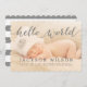 Carte Faire-part photo de naissance de bébé moderne manuscrite | Script de Parties scintillant gris argenté. Elke Clarke Designs ©. Plus de styles disponibles dans notre boutique. Parties scintillant (effet photo imprimé) typographie superposer avec les mots "hello world" dans une police de script manuscrite. Design élégant et polyvalent, vous pouvez customiser à la fois pour une petite fille et un bébé nouveau faire-part bébé. Parties scintillant argentée et rayures ou lignes blanches motif à l'arrière.