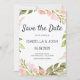 Cartes de Save the Date boho rose fleuri avec un script manuscrit noir décalé, une typographie moderne et une bordure fleurie rose peinte à l'aquarelle élégante avec des feuilles vertes luxuriantes sur fond blanc. Le dos de la carte est d'un vert assorti. Conçu exclusivement pour vous par Happy Dolphin Studio. Si vous avez besoin d'aide ou de produits assortis, veuillez nous contacter à happydolphinstudio@outlook.com. Nous serons ravis de vous aider à rendre votre mariage le plus beau jour.