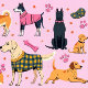 Beaucoup de chiens de différentes races portant des vêtements et des colliers, des empreintes de pattes de chiens et des os de chiens sur un arrière - plan rose.