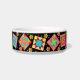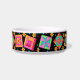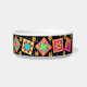 Profitez de votre amour de la courtepointe lorsque vous nourrissez votre chat avec ce plat de nourriture pour animaux de compagnie. Cet art de la courtepointe combine des blocs de patchwork piqués et appliqués préférés et des blocs uniques aux couleurs vives et dynamiques rose fushia, orange, turquoise, vert et jaune sur un arrière - plan noir. Ce design est l'art original du concepteur de tissus Phyllis Dobbs. Personnalisable .