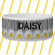 Daisy Floral Border on Rustic Old Patiné Wood Fence Personnalisé Dog's Feeding and Water Bowl présente une rangée de marguerites jaunes et blanches le long d'une vieille clôture en bois patinée et rustique qui est devenu gris d'être dehors par temps. Au-dessus de la frontière se trouve le nom du chien. Nous avons utilisé le nom Daisy, mais vous pouvez le changer pour le nom de votre chien et ajouter n'importe quel texte ou images que vous voulez.