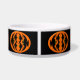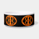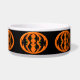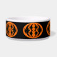 Ce magnifique bol d'animal de compagnie présente un ovale orange avec six corbeaux. Chaque corbeau a des yeux jaunes avec des élèves noirs et des ailes étirées. Les corbeaux volent vers l'autre formant une forme ovale. L'arrière - plan est noir.