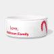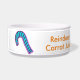 Reindeer Carrot Juice est écrit en orange. Personnaliser l'amour, Nom de famille. Les Sucres de canne bleus roses et blancs rouges sont sur les côtés du bol. Mignonne personnage de dessin animé Super Snow the Blue-eyed Reindeer. Souvenirs festifs de Noël. Oeuvre originale © 2016 TamiraZDesigns.
