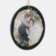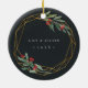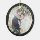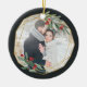 Elegantes Weihnachtsschmuck aus Foto mit einem beliebten Foto umrahmt von einem geometrischen Rahmen aus Imitaten mit Goldfolie, grünem Wasserfarbenfolien und roten Beeren. Fügen Sie in einem passenden Rahmen Ihre Namen und das Jahr oder eine benutzerdefinierte Meldung auf der Rückseite des Fensters hinzu.
