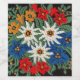 An image of a floral pattern with a needlework look of Edelweiss white Alpine flowers of Europe on your product. Blue, Red, Yellow, White Colors. Leontopodium alpinum of Switzerland, Germany und Austria.