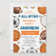 Featuring an All Star design that blends the excitement of various sports, from basketball and soccer to baseball and more, this invitation sets the tone for a day filled with athletic fun and celebration. The vibrant colors and playful graphics make it an engaging and eye-catching choice for your special occasion.