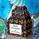 Ein Gastgeschenk mit bearbeitbaren Grunge-Briefen, die 'Happy Halloween' lesen, und Platz für Ihren Namen oder Ihre Nachricht darunter, auf einem bunten Muster von Halloween-Süßmais in Gelb und Orange.