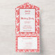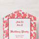 Eine editierbare Holiday Party-Einladungs-Vorlage mit Skriptbuchstaben und Retrobriefen und Platz für Ihre Party-Informationen über ein Hintergrundmuster von rot-weiß Pfefferminzbonbons gerahmt in rot.
