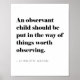 Klassisch und zeitlos, passt dieses Design zu jedem Stil. Für das Zitat wurde ein mutiger Schriftart mit eleganten Details sorgfältig ausgewählt, und für den Namen des Autors wurde ein minimalistischer, dünner Sans gewählt. Dieses Design ist für einen zeitlosen und klassischen, modernen minimalistischen Look konzipiert und bietet einen Stil, der vielseitig genug ist, um jedem Zuhause vom modernsten bis zum angesagten rustikalen Bauernhaus zu entsprechen. Dieses inspirierende Zitat wurde vor dem Hintergrund von Hauslehrern ausgewählt, kann aber auch von Lehrern und Eltern gleichermaßen geschätzt werden. Das Zitat lautet: "Ein beobachtendes Kind sollte den Dinge im Wege stehen, die es zu beobachten lohnt."