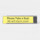 Dieses saubere und respektable Design enthält die Meldung "Bitte nehmen Sie Platz" und die Meldung "Wir werden bald zurückkehren!". Dies könnte in einer gewartet Lounge oder einem Sitzbereich genutzt werden, um Kunden, Besucher oder Kunden darüber zu informieren, dass sie in Kürze unterstützt werden und in der Zwischenzeit einen Sitzplatz haben sollten.