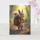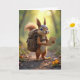 Ein niedliches Eichhörnchen mit einem Rucksack hält eine Karte, während es auf einem Waldweg stehend ist, umgeben von Eicheln und Wildblumen, um an Sie zu denken. Text kann geändert werden.