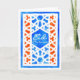 Eine Eid Grußkarte mit einem traditionellen islamischen Gittermuster im Weiß auf einem blauen und orange Hintergrund. Der Text in der zentralen Scheibe; ist im Weiß und liest, "Eid Mubarak". Entwurf handgemalt in den Aquarellen durch Judy Adamson. Das Innere wird leer für Ihre eigene Mitteilung verlassen.
