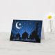 Begrüßende Illustration mit Silhouetten des Mondes, Sternen und einer Moschee am blauen Nachthimmel.