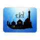 Schwarze Silhouette einer Moschee am blauen Himmel mit Sonne und Sonnenstrahlen, Grüße und Wünsche für Eid.