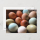 Eine wunderschöne Sammlung von einem Dutzend Hühnereiern in verschiedenen Farben und Größen, die von Hennen verschiedener Rassen in Freilandhaltung bereitgestellt werden. Weiß, Creme, Büttel, Kaffee, blau, olivgrün und sogar gesprenkelte Eier!