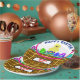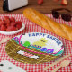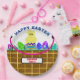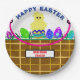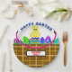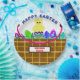 Zweifarbiger Osterkorb mit dekorierten Eiern in Rosa und Grün Ostergras und rosa Griff. Glückliche Ostertypografie in tiefblau. Niedliches gelbes Küken aus farbenfroh gestreiftem Ei in rot, gelb, blau, grün und lila geschlüpft. Typo Familienname in rot im schwarz-weißen Rechteck. Original Artwork Design © TamiraZDesign.