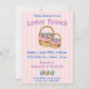 Machen Sie sich mit dieser Einladung für Ihren Osterbrunch und Ihr Egg Hunt Party auf Osterfeier gefasst. Mit einem hübschen Korb voller bunter Eier. Auf einem rosa und weiß gestrichenen Hintergrund. Auf der Rückseite ein niedliches Polka-Muster, das dem gesamten Kartendesign entspricht.