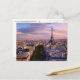 Blick über Paris, Frankreich, dominiert vom Eiffelturm und einer spektakulären lila Wolkenkratzer. Foto von Moyan Brenn