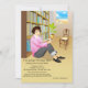 Eine bunte Einladung, die eine Frau in der Hand sitzt auf dem Boden vor einem Bücherschrank mit einem Buch kennzeichnet.