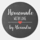 Moderner Aufkleber "hausgemacht mit Liebe" mit einem weißen Schriftart auf schwarzem Chalkboard-Hintergrund, der durch ein niedliches rotes Herz geschmückt ist. Text anpassen.