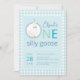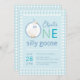 Zum ersten Geburtstag eines Babys mit dem Thema "Eine alberne Gans". Der Hintergrund ist hellblau und weiß Gingham karierte karierte Muster. Der Text befindet sich in einem hellblauen Rechteck mit abgerundeten Ecken und weißem Rand. Das Wort ONE hat jeden Buchstaben in einem anderen Schatten und eine weiße Gans mit einem blauen Party, der sich im großen O befindet. Der Name ist in einem blauen Skript geschrieben. Im unteren Teil ist die Info, mit dem Datum / Uhrzeit als verlassen Spalte, mit dem Tag groß; sie werden durch weiße Linien getrennt. Die Gans wird mit Fotoshop's AI erzeugt. Ich habe das Recht, meine erzeugten Bilder für jeden rechtlichen Zweck, auch für den kommerziellen Gebrauch, zu nutzen und in meine Werke zu integrieren.
