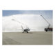 Ein F-18 Flugzeug sitzt unter dem Spray von Feuerwehrfahrzeugen mit F-18.