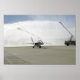 Ein F-18 Flugzeug sitzt unter dem Spray von Feuerwehrfahrzeugen mit F-18.