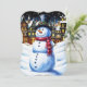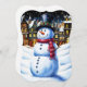 Ein fröhlicher Schneemann mit einem Hut und rotem Schal steht im Vordergrund einer schneebedeckten Dorfszene. Die Lichter der Häuser erhellen den Nachthimmel und schaffen eine festliche und gemütliche Atmosphäre. Digitale Kunstfotografie CS5