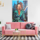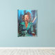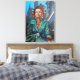 Eine selbstbewusst gestellte Frau mit intensivem Blick wird vor einem abstrakten Hintergrund mit Wolkenkratzern dargestellt. Ihre Kleidung weist auf einen Vintagen oder Retro-Stil hin, besonders in dem üppigen grünen Kleid und dem stilvollen Hut.