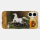 Elegantes und klassisches Design mit altgediegenem Grunge, braunen Pergamenteffekten und leuchtend gelb-orangefarbenem Edelstein, Gemälde des französischen Malers Alfred-de-Dreux 19. Jahrhunderts. Schönes orientalisch weißes arabisches Pferd mit Hunden. in lebhaften braunen, weißen, grauen Farben. Klassisches Monogramm-Design leicht anpassbar mit Ihren Initialen.
