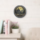 Dieses runde, bronzefarbene gerahmte Schild zeigt den fetten, metallischen Text "IN DIESEM HAUS WIR HOWL AT THE MOON". Im Hintergrund heult eine Silhouette des Wolfs auf einem großen Vollmond über einem Pinienwald. Die Kunst ist sehr dunkel, whimsikal und etwas gotisch, was sie perfekt für eine abwechslungsreiche Dekoration macht.