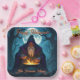 Ein Hexenmeister in Schwarz und lila, der die Zutaten für ein vollkommenes Halloween-Party unter Vollmond aufreißt.
