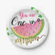 Wassermelone "eine in einer Melone" Geburtstags-Party-Papier-Teller mit einer yummy Watercolorwassermelone, Imitatgoldsamen und Schriftart mit Reben.