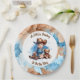 Niedlicher kleiner Cowboy Baby Boy und Teddy Bear Blue und Brown ai Aquarellbilder Baby Dusche Papier Teller. Ein kleiner Cowboy ist unterwegs.