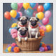 Drei bezaubernde Mops sitzen in einem Korbkorb mit bunten Blume. Ein fröhlicher Ballonhaufen in verschiedenen Farbtönen treibt sich über sie und verleiht der festlichen Atmosphäre eine fröhliche Note. Die Mops, die jeweils einen roten Kragen tragen, blicken mit ihren charaktervollen Ausdrücken direkt auf den Betrachter.